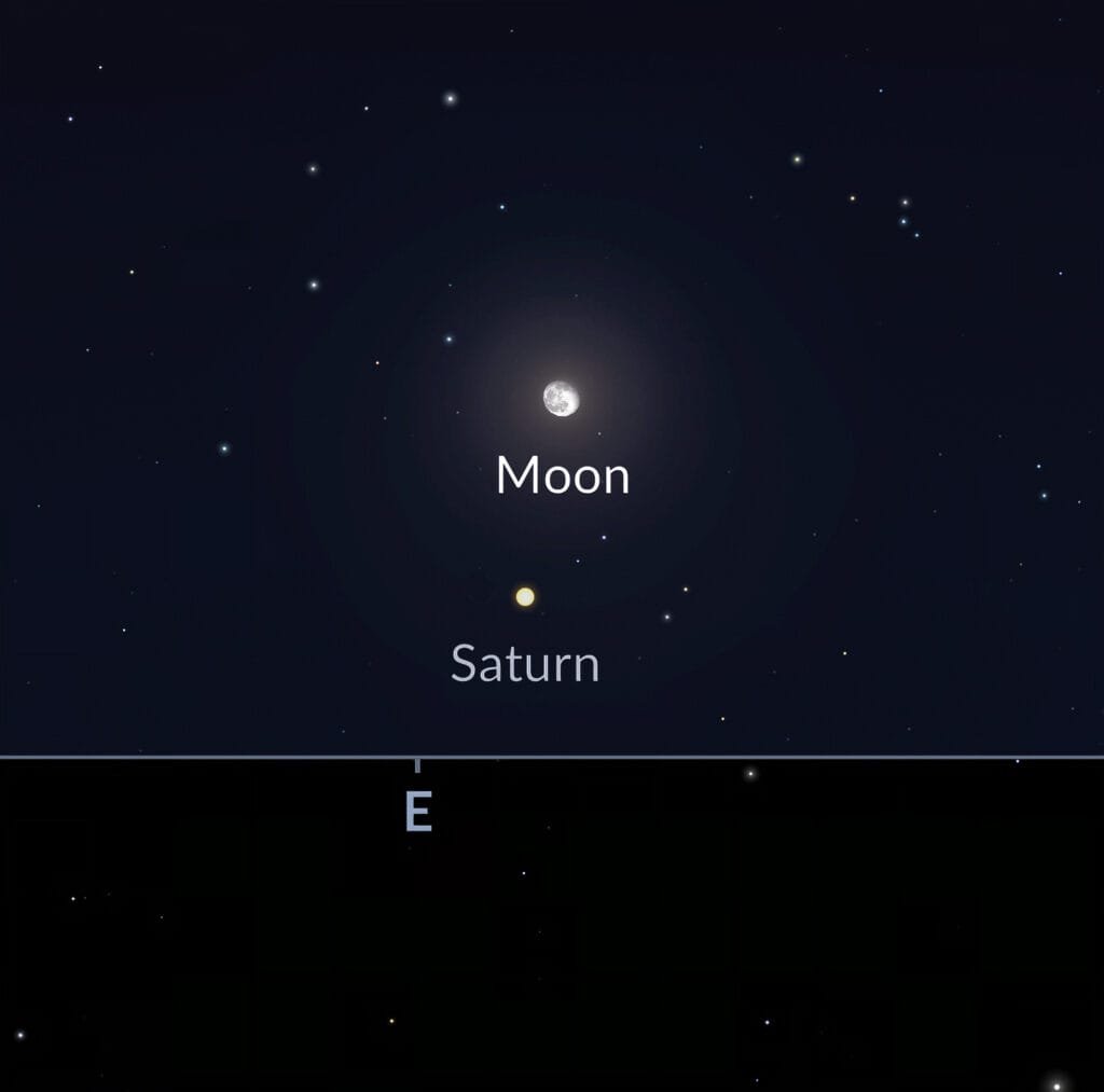 Durante la noche, Saturno se podrá observar justo debajo de la Luna, formando un atractivo dúo astronómico. Ambos astros serán visibles desde las 21:00 en dirección este. El planeta de los anillos brillará con una magnitud aparente de 0.90, mientras que la Luna menguante estará iluminada en un 90%.