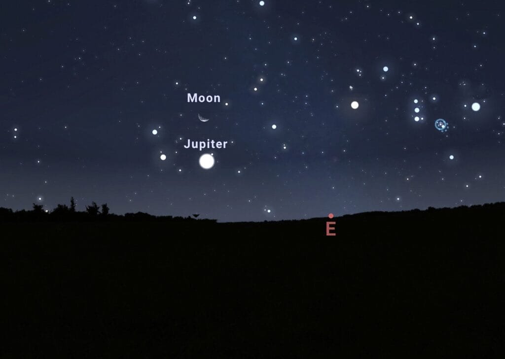 Durante la madrugada, Júpiter se podrá observar cercano a la Luna, formando un llamativo dúo astronómico. Ambos astros serán visibles desde las 2:00 UTC-6 en dirección este-noreste. El planeta más grande del Sistema Solar brillará con una magnitud aparente de -1.91, mientras que la Luna menguante estará iluminada en un 33%.