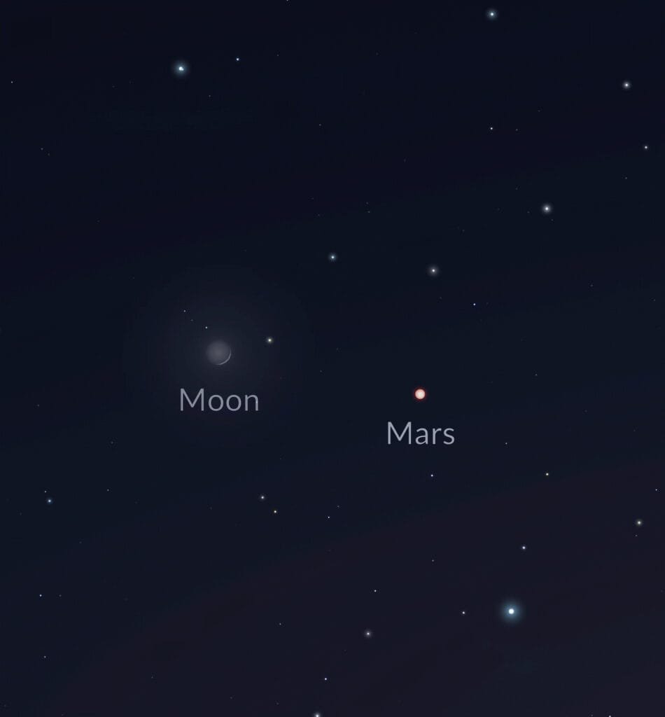 Justo después del atardecer, Marte aparecerá cercano a la Luna, formando un llamativo dúo astronómico. Los astros serán visibles desde las 19:00 UTC-6 en dirección oeste-suroeste. El planeta rojo brillará con una magnitud aparente de 1.58, mientras que la Luna creciente estará iluminada apenas en un 7%.