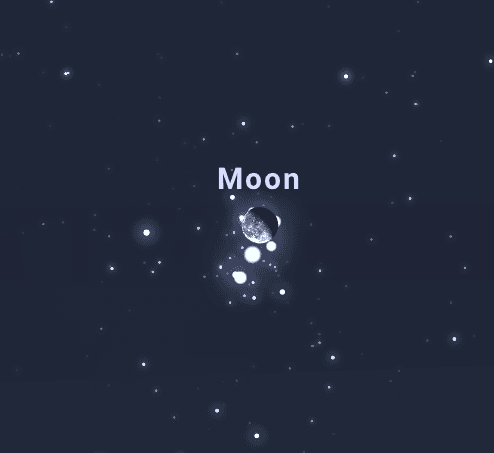 Después del anochecer, la Luna se ubicará cercana al cúmulo de las Pléyades. Ambos objetos serán visibles desde las 22:00 sobre el horizonte este-noreste. A medida que avance la noche, la Luna pasará frente a las Pléyades y las ocultará. La Luna menguante estará iluminada en un 68%, mientras que las Pléyades presentarán una magnitud aparente de 1.59.
